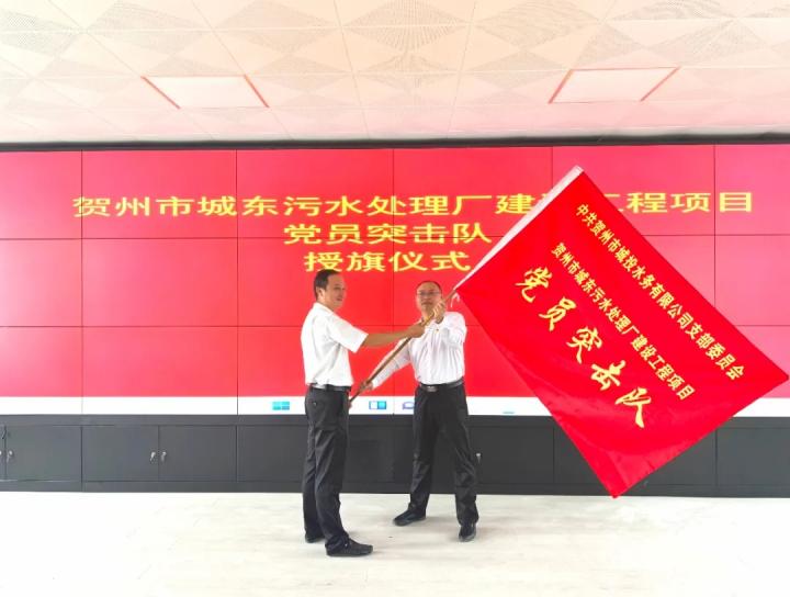 在活動現(xiàn)場,李羅清向黨員突擊隊隊員代表授旗,黨員突擊隊隊員代表作出承諾,表示將充分發(fā)揮先進(jìn)性,確保出色完成賀州市城東污水處理廠建設(shè)工程項目各項收尾建設(shè)和調(diào)試運行工作。